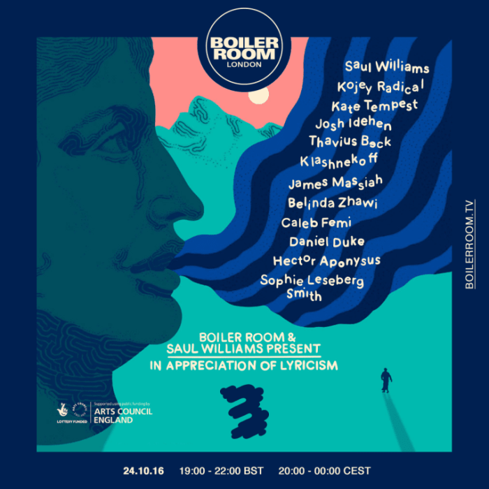 October 24 will see Boiler Room and Saul Williams present an evening dedicated to the art of lyricism and spoken word. The London event will see a line-up including Mercury-nominated artist Kate Tempest perform live alongside KLASHNEKOFF, Kojey Radical, and James Massiah. The event will be split into two parts. The first segment will see … Continue reading Boiler Room And Saul Williams Team Up On An Evening Dedicated To Lyricism And Spoken Word (via The Fader)