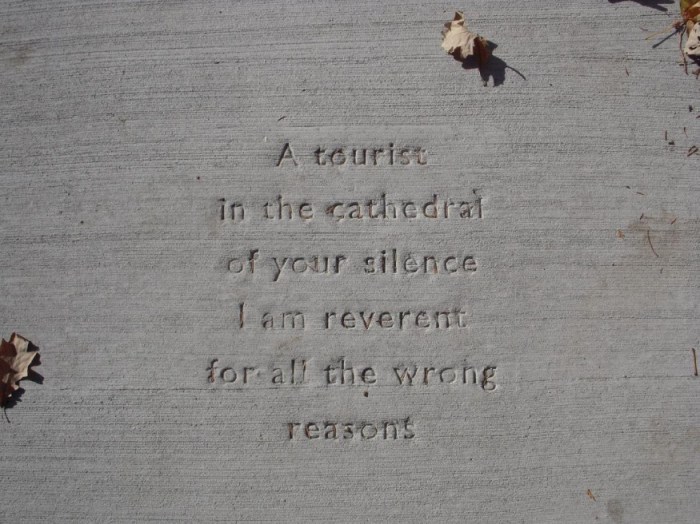 People with a knack for verse will get an opportunity to cement their legacy in Cambridge this spring. As crews from the Department of Public Works replace sidewalks damaged by the winter’s historic snowfall, they will imprint poetry written by residents into the slabs, hoping to capture the attention of pedestrians. Called the “Sidewalk Poetry” … Continue reading Cambridge offers poets chance to make their mark on sidewalks (via Boston Globe)